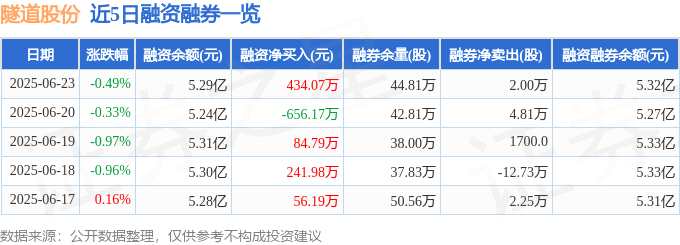 隧道股份融資融券信息顯示,融資方面,當(dāng)日融資買入1134.58萬元,融資償還700.51萬元,融資凈買入434.07萬元。融券方面,融券賣出4.46萬股,融券償還2.46萬股,融券余量44.81萬股,融券余額271.55萬元。融資融券余額5.32億元。