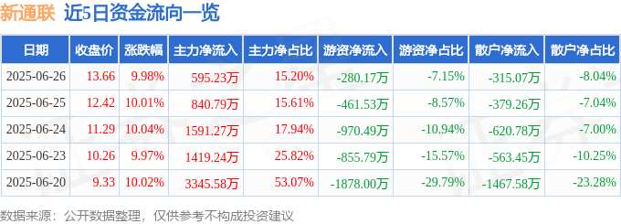 摘要: 消息,截至2025年6月26日收盤,新通聯(lián)(603022)報(bào)收于13.66元,上漲9.98%,已連續(xù)漲停5天,換手率1.43%,成交量2.87萬手,成交額3916.94萬元。