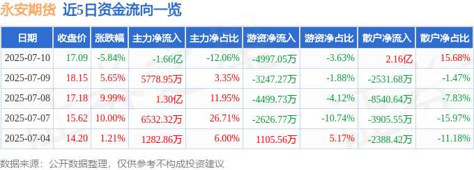 消息,截至2025年7月10日收盤,永安期貨(600927)報(bào)收于17.09元,下跌5.84%,換手率5.35%,成交量77.91萬手,成交額13.78億元。