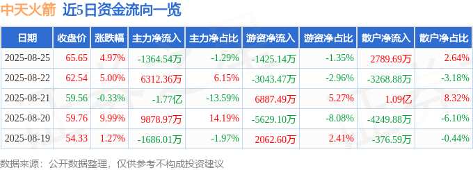 消息,截至2025年8月25日收盤(pán),中天火箭(003009)報(bào)收于65.65元,上漲4.97%,換手率10.85%,成交量16.86萬(wàn)手,成交額10.56億元。