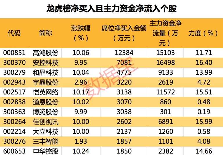 從盤口資金流向來看,主力資金凈流入超千萬且龍虎榜凈買入個股共有14只,其中安控科技、高鴻股份、愷英網(wǎng)絡(luò)等個股資金凈流入金額最大。凈流入力度最大的個股有香江控股、山東路橋、夢舟股份,凈流入力度分別為29.38%、21.98%、18.42%。