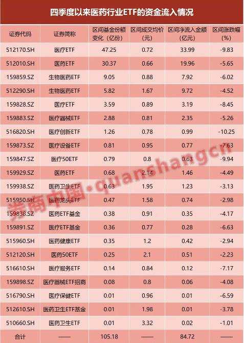 與此同時,易方達(dá)的醫(yī)藥ETF在四季度獲得了19.96億元的凈申購,國泰的生物醫(yī)藥ETF、天弘的生物醫(yī)藥ETF等也獲得了超5億元的資金凈流入,而上述ETF均在此區(qū)間有5%左右的跌幅。